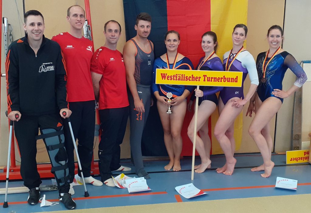 Hans-Gerd Herning, Reinhard Sieblitz und Friedrich Breer bei den über 60jährigen. Für Egberts Gruppe am Samstag lief es rund: Als vierter in der Einzelwertung gewann Egbert mit den Westfalen die Meisterschaft der Landesturnverbände. Das junge Gemüse musste am Sonntag ran. Thorsten Walter musste nur am Pauschenpferd einmal absteigen, zeigte sonst seine gewohnt soliden Leistungen und wurde mit einem beachtlichen 6. Platz in der Einzelwerung belohnt. Ziel war es gewesen, beim Einstand unter die besten 10 zu gelangen. Olaf Klinke leistete sich ebenfalls einen Patzer am Reck, turnte an allen anderen Geräten durch. Am Ende reichte es für Platz 7 in der Einzelwertung. Die westfälische Mannschaft hatte sich vor allem gegen zahlreich und gut vorbereitet auftretende Thüringer zu behaupten, die denn auch den Titel der Landesturnverbände gewannen. Marcel Jörgens aus Paderborn zeigte einen schwierigen Salto rückwärts mit ganzer Schraube am Sprung, seinem ersten Gerät, und verdrehte sich bei der Landung das Bein. Krankenhaus, Wettkampf vorbei. Ohne Marcels starke Übungen an den folgenden Geräten war keine Schnitte mehr zu machen und so war es am Ende Platz 5 für die westfälische Herrenmannschaft. Dank weiblicher Unterstützung aus Schloß Neuhaus durften wir dennoch einmal aufs Treppchen: Den zweiten Platz als gemischte Mannschaft konnte sogar Marcel, mittlerweile mit Schiene und Gehhilfen, mit uns feiern.